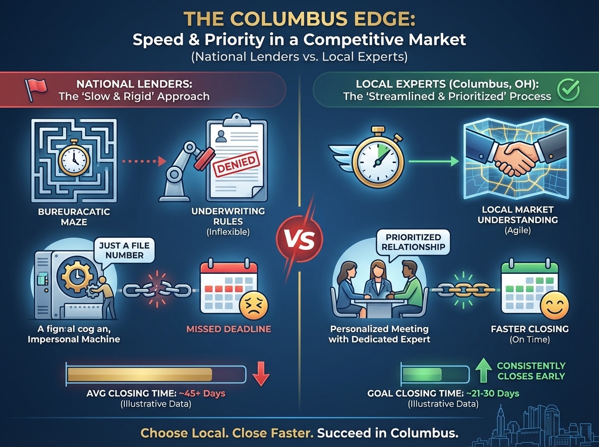 In a competitive market like Columbus, Ohio, speed is just as important as cost. One of the biggest red flags with national lenders is their notorious reputation for slow communication and rigid underwriting rules. These large institutions often treat you as just another file number, leading to missed deadlines and unnecessary stress.